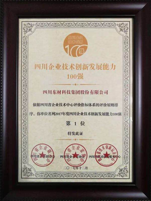 12月8日,2017四川100強企業(yè)發(fā)布會在成都舉行。四川東材科技集團股份有限公司在企業(yè)技術(shù)創(chuàng)新發(fā)展能力100 強中位列第一。